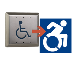 Puisque la loi empêche présentement l'utilisation du nouveau symbole sur les plaques à pousser, les entreprises n'utilisant pas le Symbole d'accès universel traditionnel exigé par le code s'exposent à des poursuites. Camden est consciente du symbole du fauteuil roulant alternatif depuis un bon moment. En réponse, nous offrons des interrupteurs qui comprennent le nouveau symbole d'accessibilité embossé avec l'élément graphique peint.