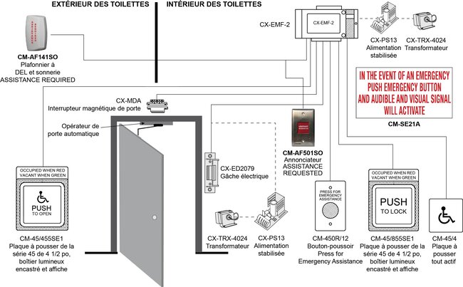 Système d’appel d’urgence utilisant des interrupteurs momentanés « appuyez pour l’assistance d’urgence », autonome ou installé avec les kits de commande de toilettes sans obstacle Camden CX-WC11, 12, 13 ou 14, pour les portes équipées d’opérateurs automatiques.