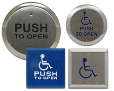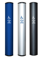 Les ensembles d'interrupteurs et de boîtiers de plaques à pousser lumineuses Aura🅪 CM-54 (boîtiers carrés pour montage en surface), CM-55 (boîtiers carrés pour montage encastré) et CM-57 (boîtiers ronds pour montage encastré) procurent une grande visibilité et une commodité aux clients dans des applications de portes automatiques conformes à l'ADA...