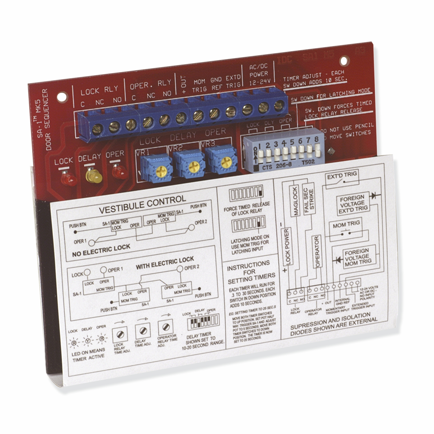 Le modèle économique CX-SA1 comporte un déclencheur temporaire ou prolongé, deux relais et trois minuteries. Le modèle CX-SA1 établit la séquence d'un automatisme de porte et une serrure électrique (de toute catégorie) ou les deux portes qui ferment un vestibule et devient un relais de verrouillage par le simple actionnement d'un interrupteur.