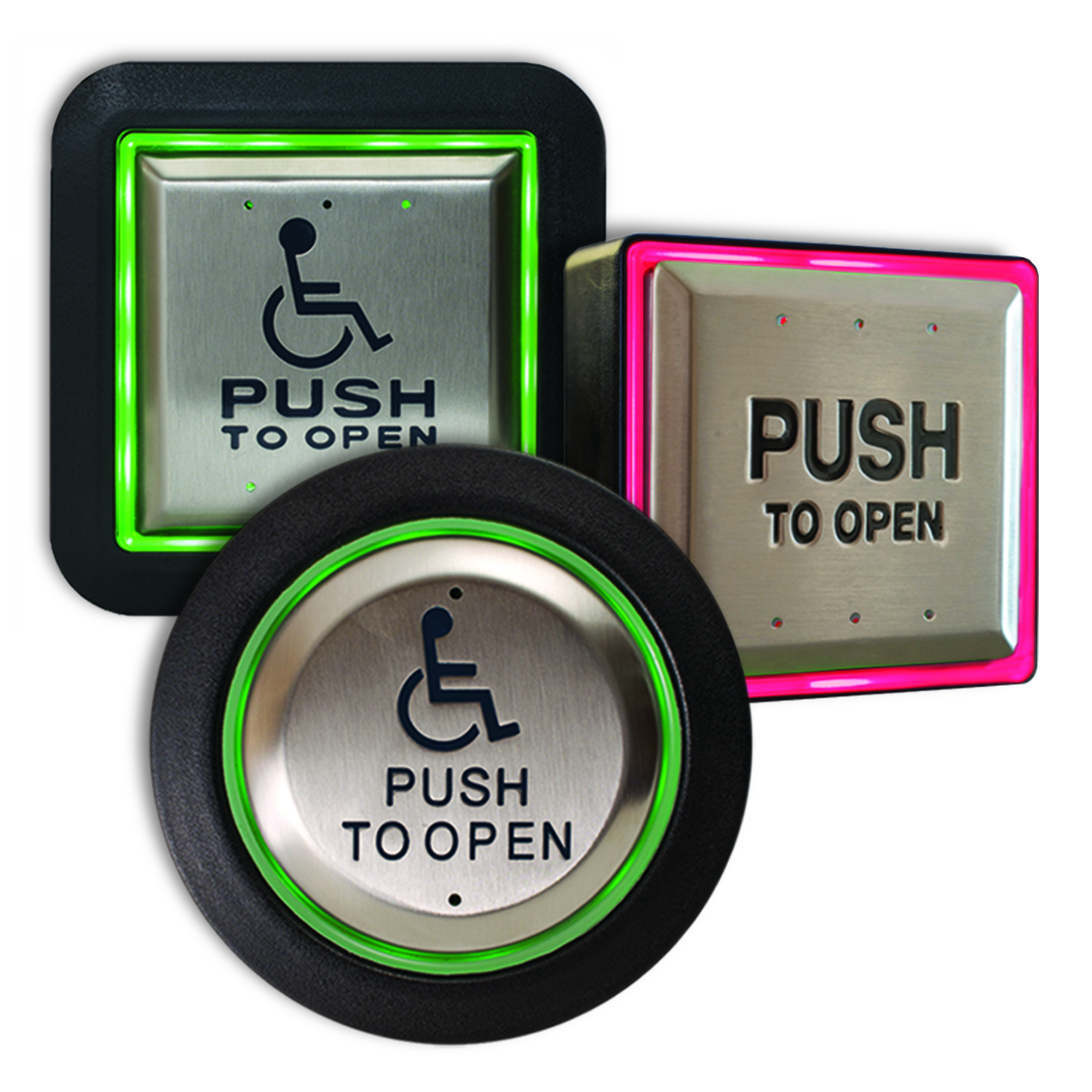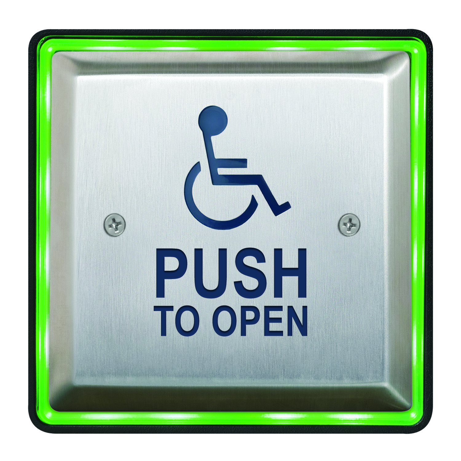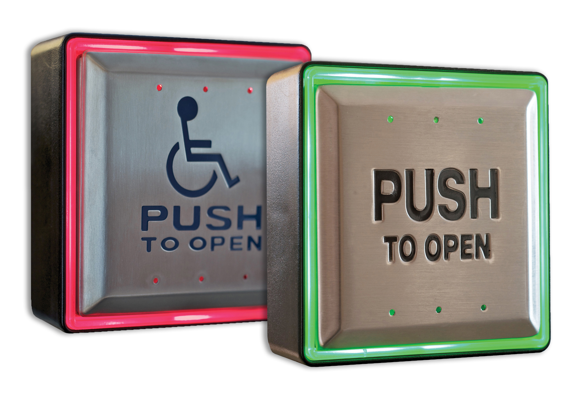 Les boîtiers de plaque de poussée éclairés Aura ™ CM-54 (carré de surface), CM-55 (carré affleurant) et CM-57 (rond affleurant) offrent une grande visibilité et une commodité accrue pour l’utilisateur dans les portes automatiques conformes à l’ADA et d’autres applications.