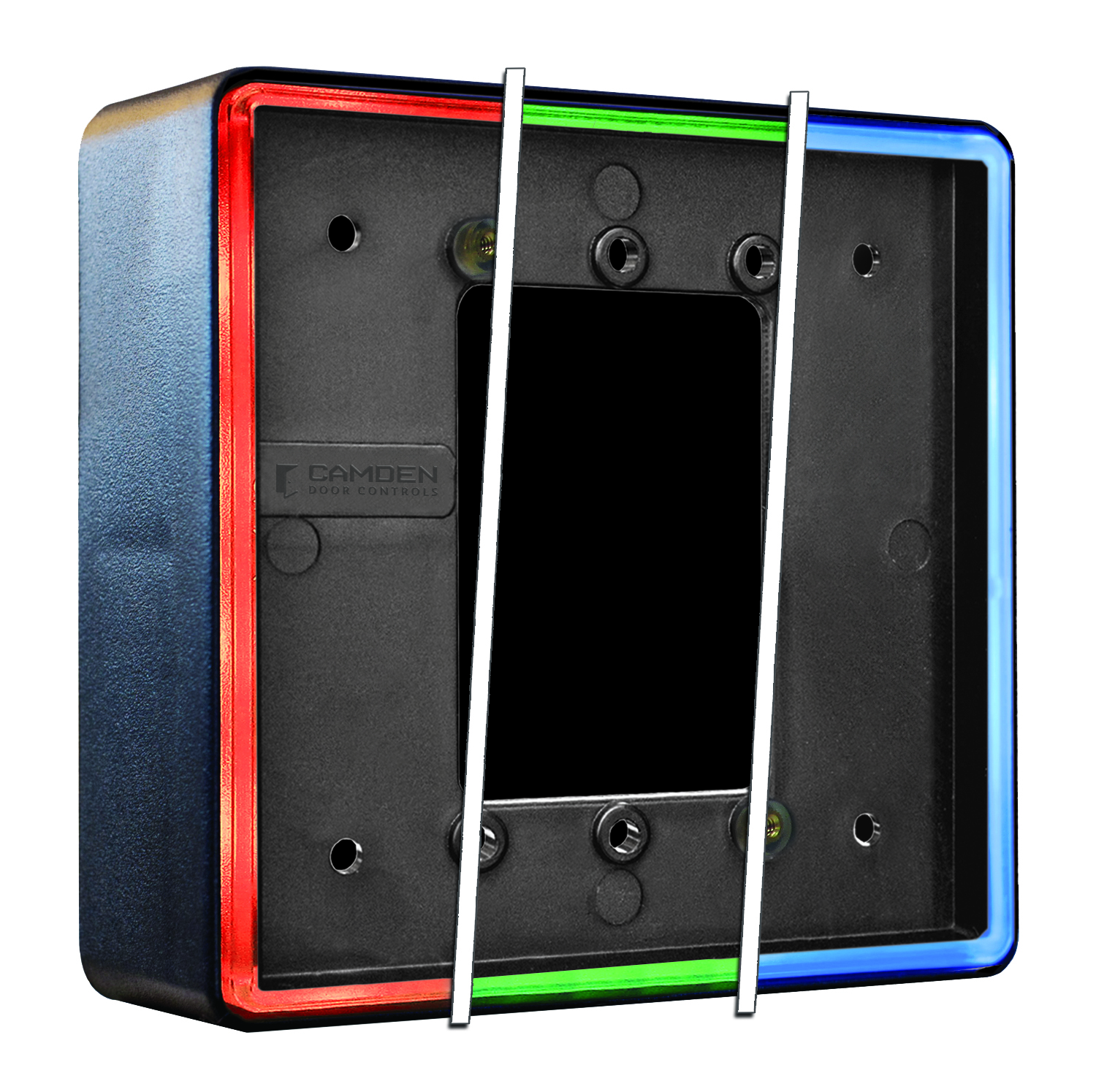 Plaque de poussée carrée de 4-1/2" (vis dissimulées) avec sirène, boîtier CM-54i à montage en surface illuminé ROUGE/VERT/BLEU