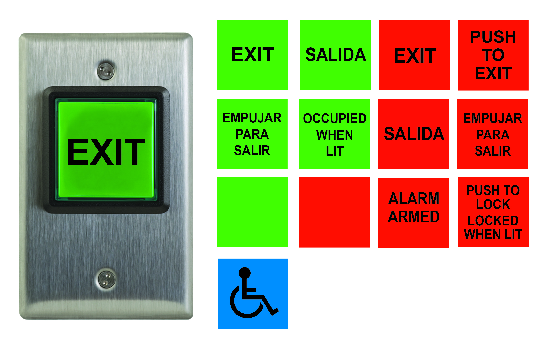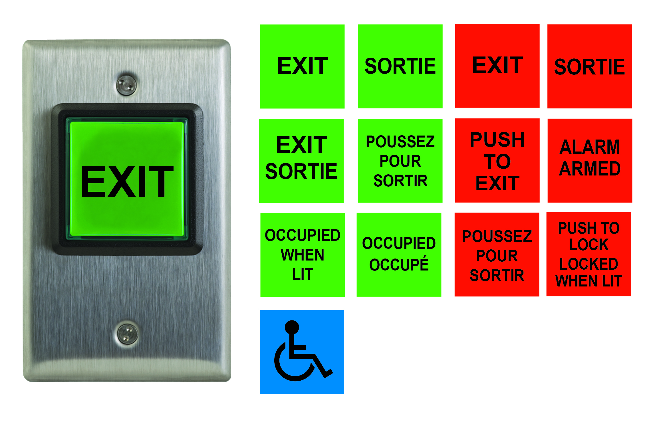 (20) étiquettes d’insert anglaises, françaises et espagnoles, DEL 12V - 28V illuminées (Rouge et vert) : Push to Exit, Exit, Occupied When Lit et symbole handicapé.