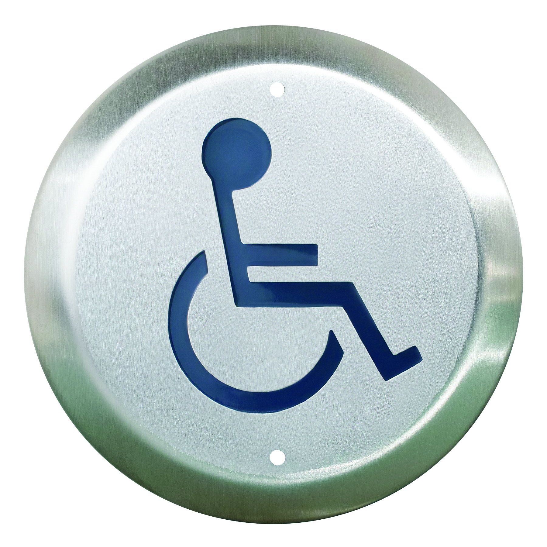 Symbole « FAUTEUIL ROULANT ACTIF » et texte « Pousser pour ouvrir », bleu. Non livrable sur les interrupteurs Column(MC) en acier inoxydable