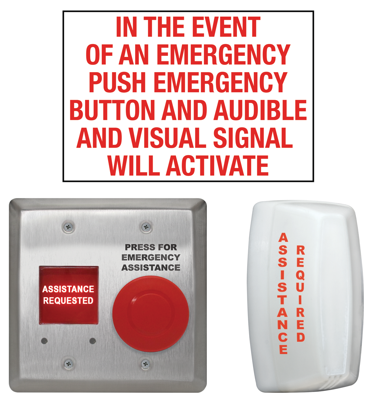 Bouton-poussoir coup-de-poing à commande double, plaquette en acier inoxydable, pousser/tirer, rouge, «Aide demandée», avec voyant DEL et résonateur réglable, «Aide demandée»;