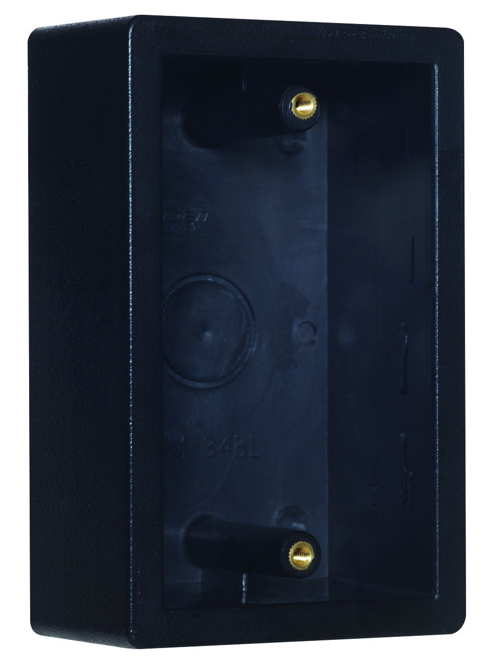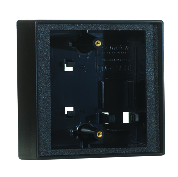 Boîtier en applique, profondeur normale, réserve pour le sans fil. Polymère noir (ABS) de profondeur normale résistant aux chocs et aux flammes, L 41/2po x H 41/2po x P 2po. À utiliser pour les commutateurs de plaque de porte ronde de séries CM-60/46.