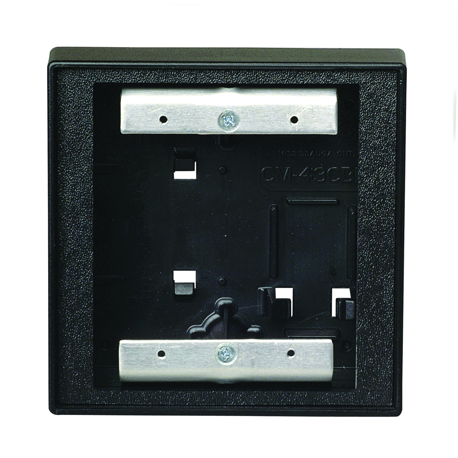 Surface Box, profondeur standard, provision pour le sans fil. Double paroi, polymère noir (ABS) résistant aux flammes/chocs, 4-1/2" L x 4-1/2" HX 2" P. À utiliser avec les interrupteurs de vestibule CM-2510 et CM-2520