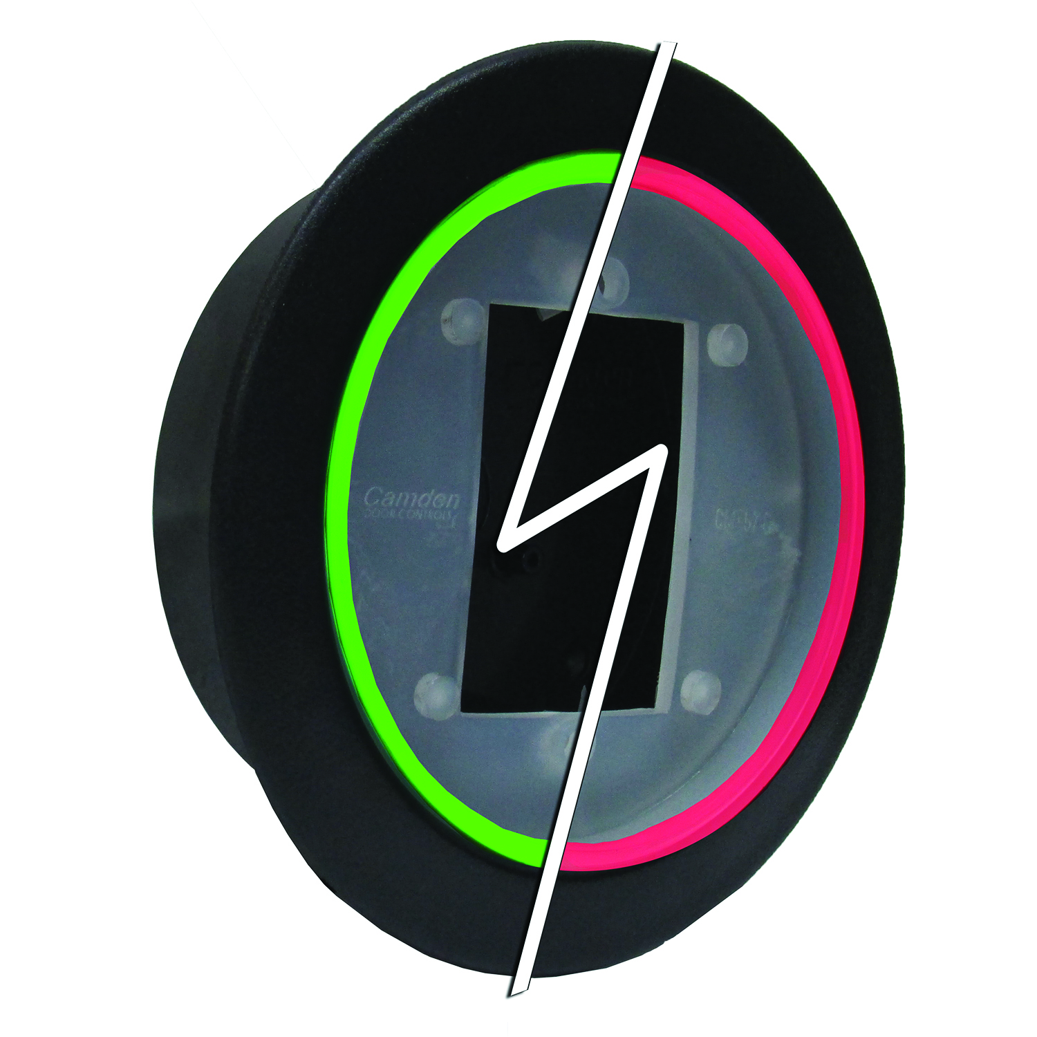 encastré, rond (éclairage ROUGE/VERT). Polymère noir (ABS) de profondeur normale résistant aux chocs et aux flammes, 65/8po de diamètre x 2po de profondeur.