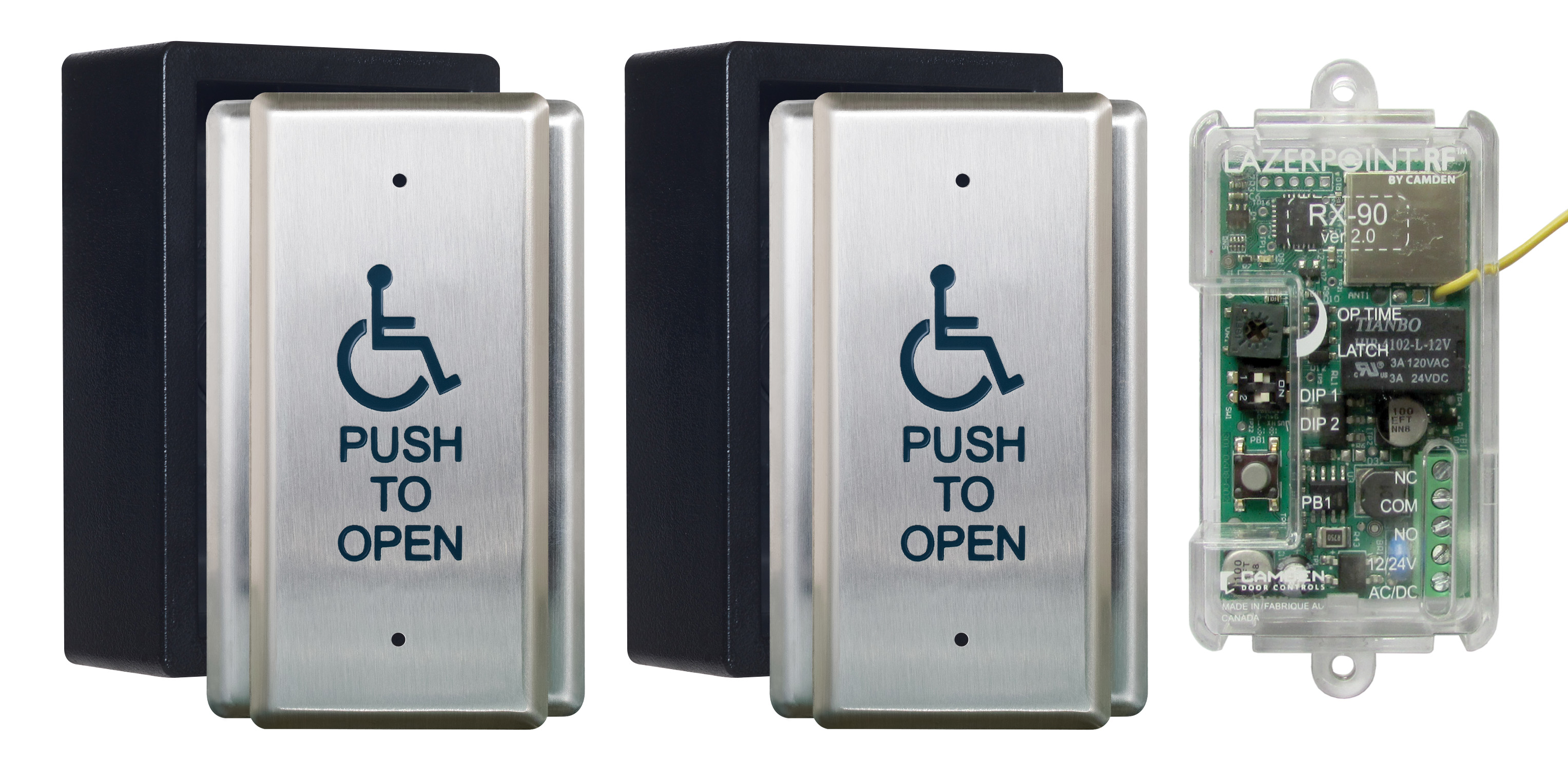 Kinetic par Camden™ est le seul système sans fil de «récupération d'énergie» doté d'un récepteur ultra-compact (facilement installé dans les armoires d'opérateur de porte automatique), avec un fonctionnement de relais momentané, retardé ou à verrouillage sélectionnable sur le terrain. Le système sans fil est compatible avec toutes les marques d'opérateurs de portes automatiques et est conçu pour fournir une activation de porte fiable dans toute application commerciale, industrielle et institutionnelle. Kinetic de Camden™ Les systèmes sans fil sans pile sont conçus pour des applications intérieures ou extérieures. Pour les interrupteurs directement exposés à la pluie ou à la neige, une option d'interrupteur étanche est recommandée. Veuillez noter: les émetteurs Kinetic™ sans batterie ne peuvent pas être utilisés avec l'interrupteur mural à spectre étalé Lazerpoint RF , FOB, clavier ou émetteurs sans fil mains libres.