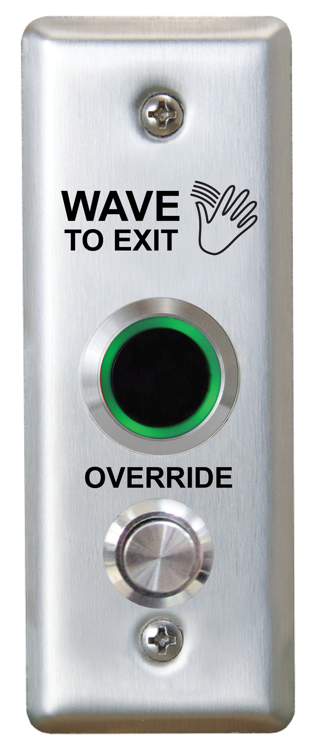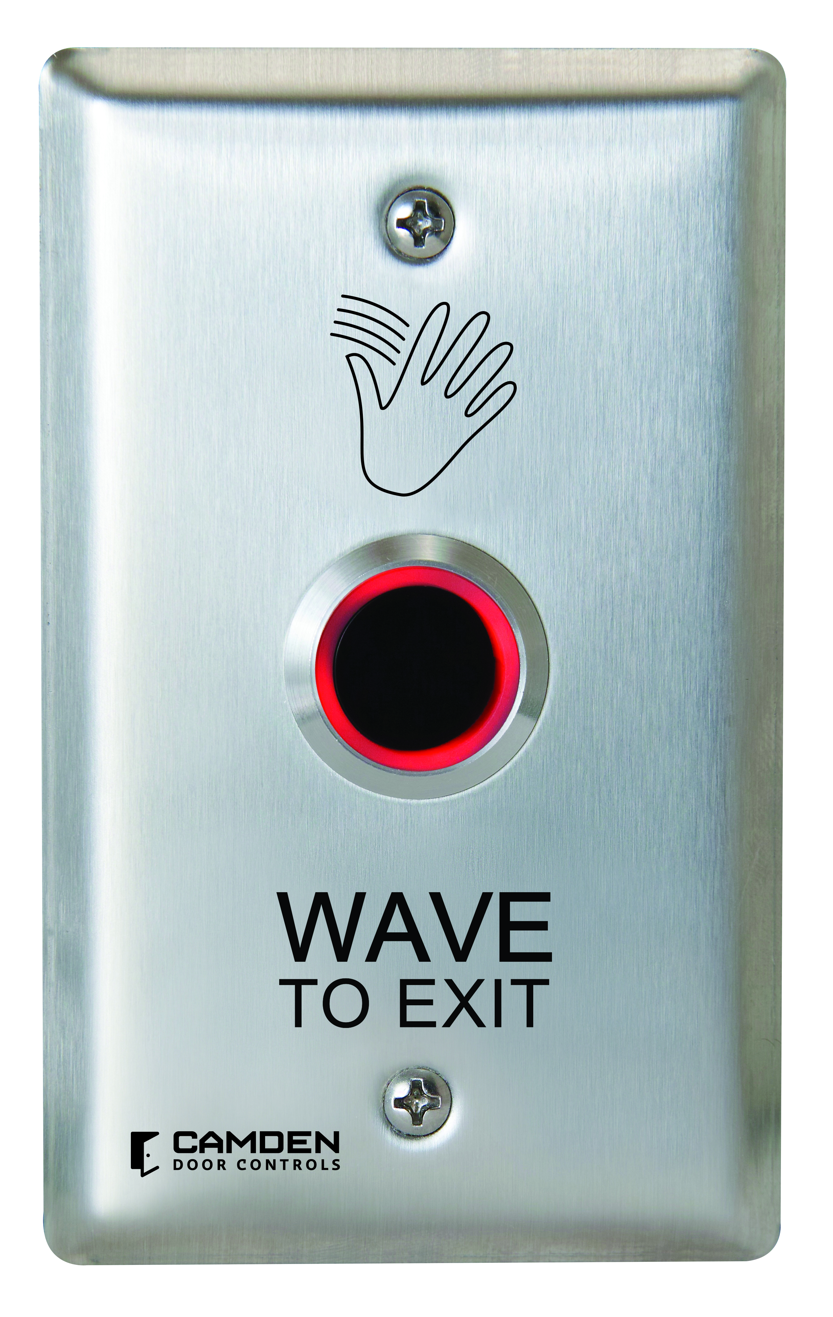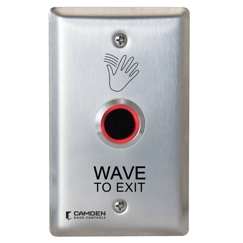 Interrupteur sans contact ValueWave!", un seul groupe, graphiques « Wave to Exit ». Boîtier de montage en surface compatible CM-34BL. Éclairage rouge/vert.