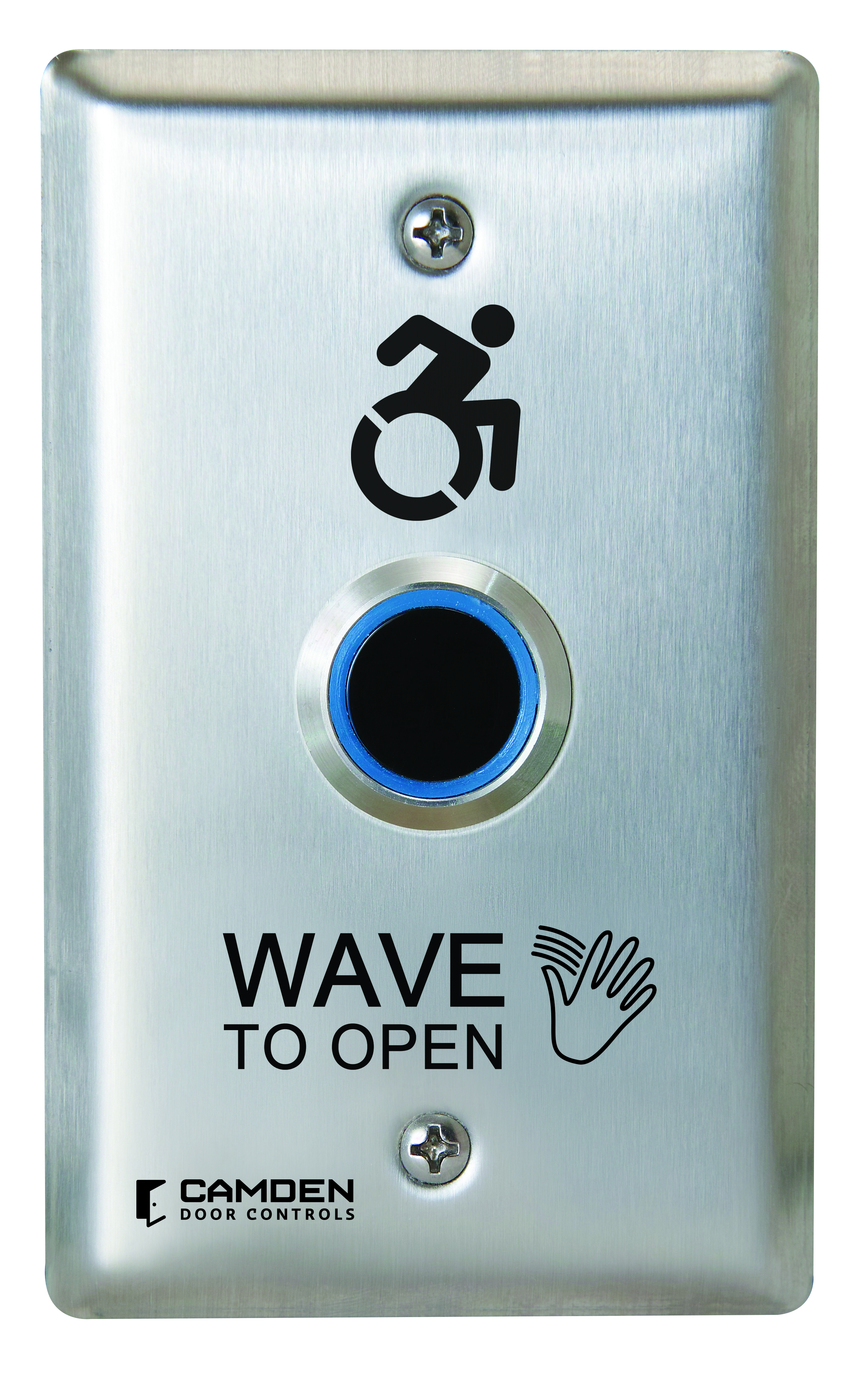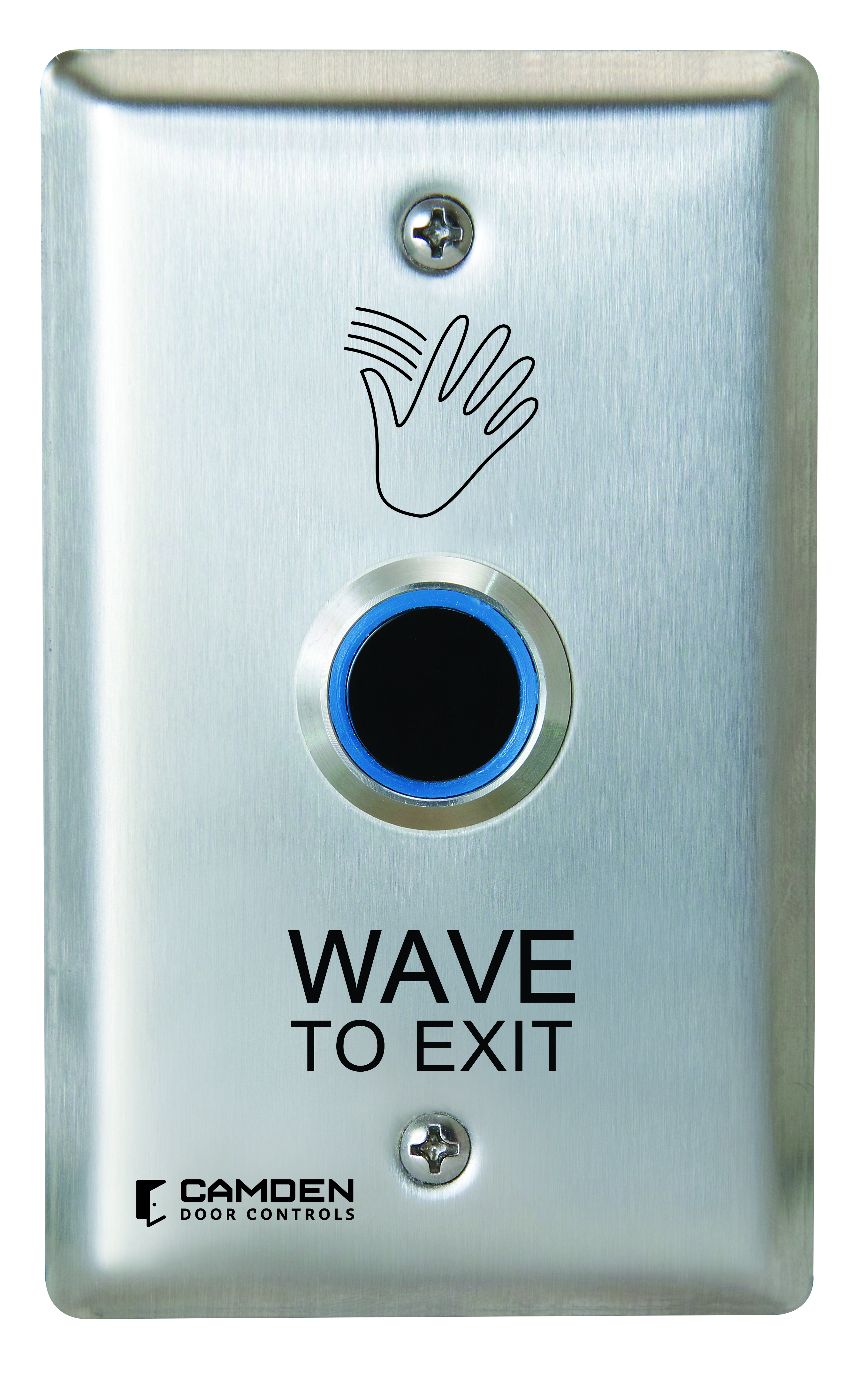 Interrupteur sans contact ValueWave!", un seul groupe, graphiques « Wave to Exit ». Boîtier de montage en surface compatible CM-34BL. Éclairage bleu/vert.
